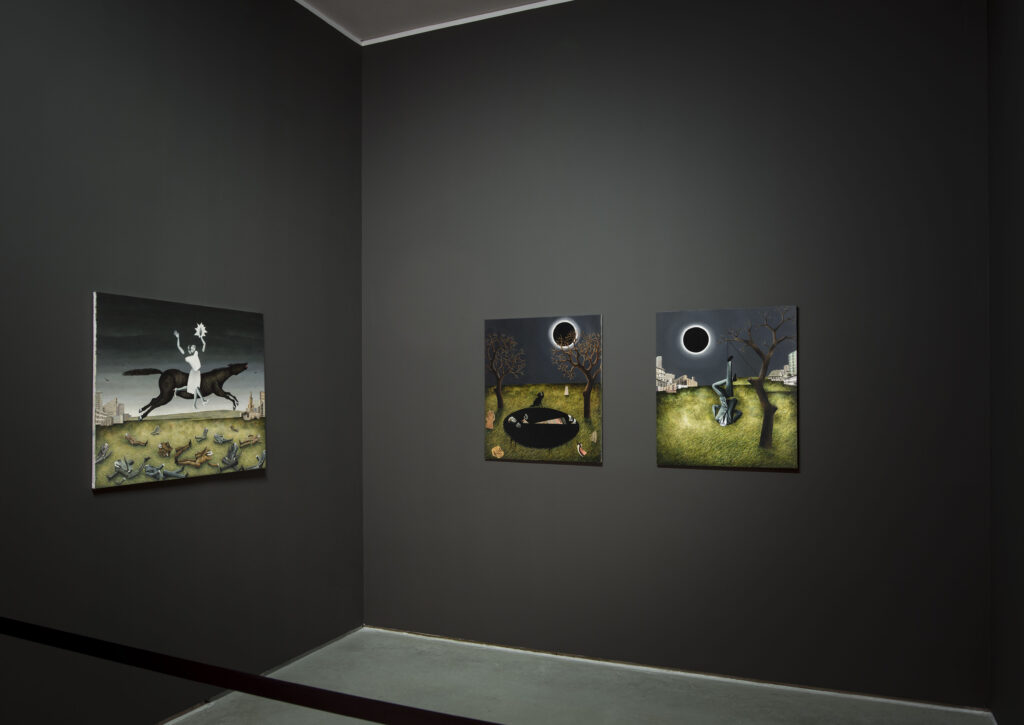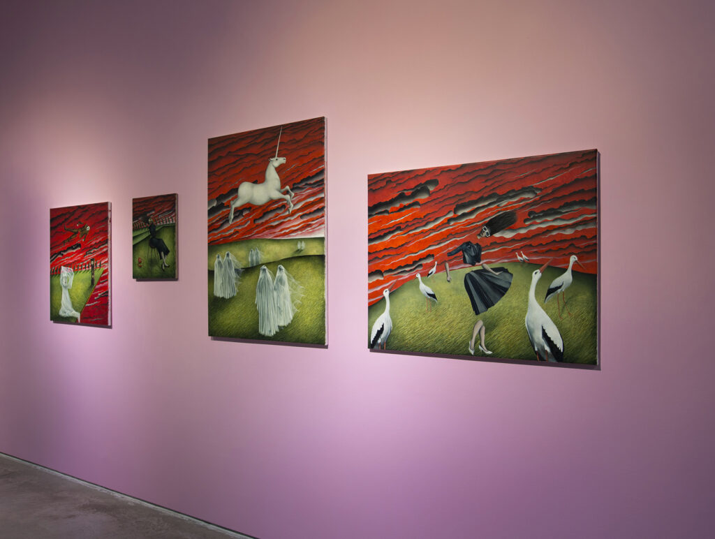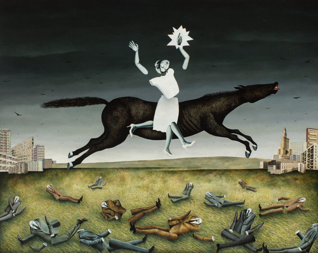 Mateusz Szczypiński w najnowszym cyklu obrazów Witch hunt (2022-2023) przygląda się rozbudowanej sieci dzisiejszych rytuałów, których formy co prawda uległy uwspółcześnieniu, ale intencje ich sprawowania – niekoniecznie. Specyficzna patchworkowa forma prac, łącząca różne stylistyki europejskiej sztuki z ikonicznymi kompozycjami (Pieter Bruegel Starszy, John Everett Millais, Marc Chagall, Norman Lewis), wzmacnia niejednoznaczny w ocenie świat obrzędów, umożliwiających nam z jednej strony wspólnotowe doświadczenia, ale i narzucających sztywne ramy funkcjonowania. Bezoczne wiedźmy, Ofelie i Walkirie Szczypińskiego, otoczone bezgłowymi marionetkami w garniturach, obserwujemy w chwili, gdy stają na głowie, by odwrócić te przewidywalne scenariusze.